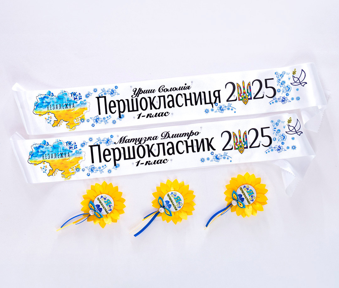 На стрічці зображена карта України та герб замість дати, оздоблена сяючими стразами. У комплекті значок діаметром 8,5 см, який гармонійно поєднується зі святковою атрибутикою та створює урочистий настрій до 1 вересня